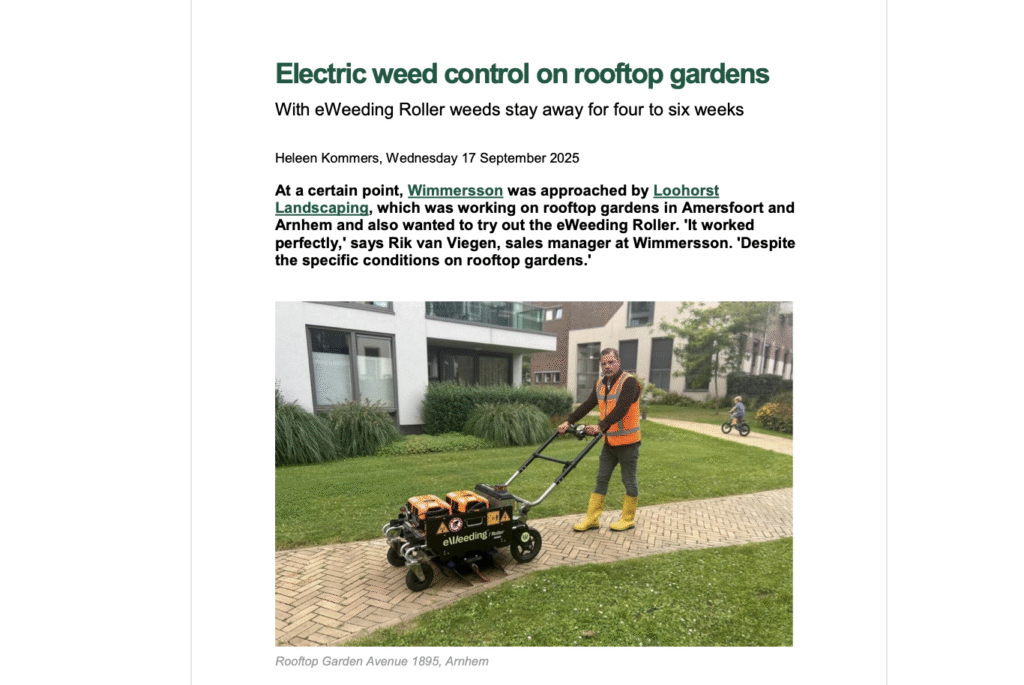 “Effective Weed Control, including the roots” Wimmersson recently introduced the eWeeding Roller Powered by Zasso to visitors at the National Grass Day event in Belgium. During this event, the initial results achieved with this emission-free innovation in weed management were also presented. For instance, it was revealed that horsetail (equisetum), a particularly challenging weed to